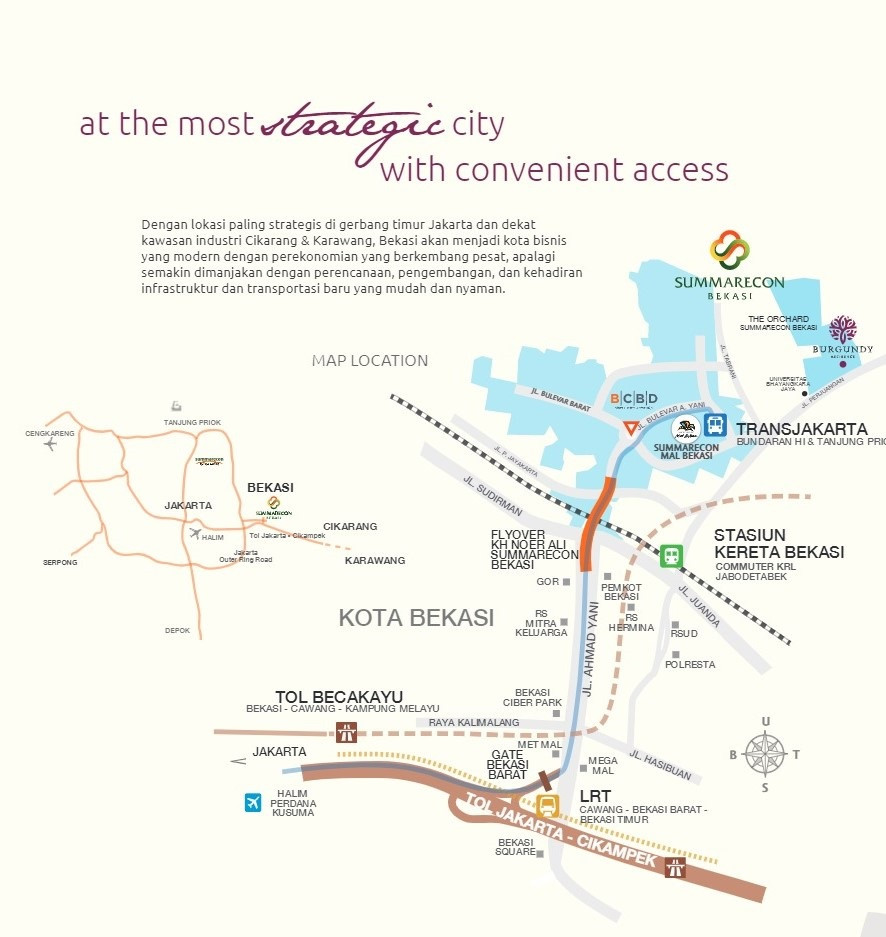 Dikarenakan Burgundy Residence merupakan bagian dari Summarecon Bekasi, tentunya ia dapat Anda akses dengan mudah. Summarecon Bekasi sendiri memiliki akses Flyover KH Noer Ali yang langsung menghubungkan Jalan Protokol Ahmad Yani dengan jalan Boulevard Ahmad Yani.