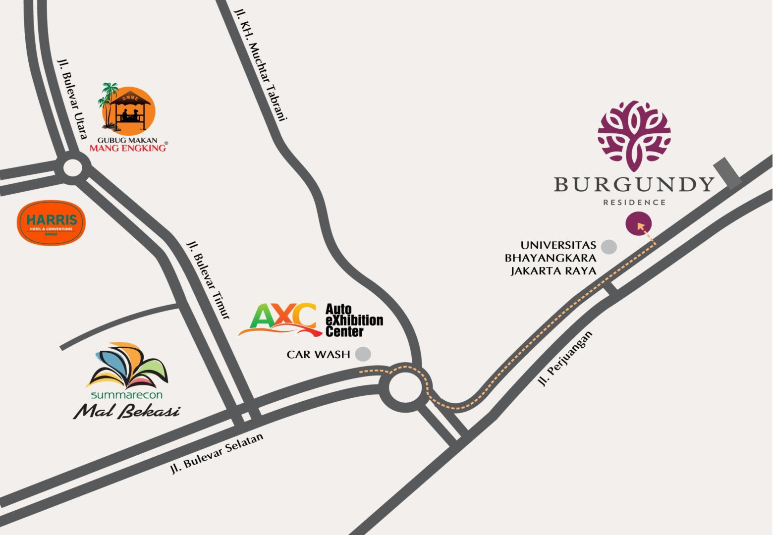 Burgundy Residence memiliki lokasi yang sangatlah strategis. Lebih tepatnya, ia berada tepat di samping Universitas Bhayangkara Jakarta Raya dan dalam jarak waktu tempuh 5 menit menuju Summarecon Mall Bekasi.