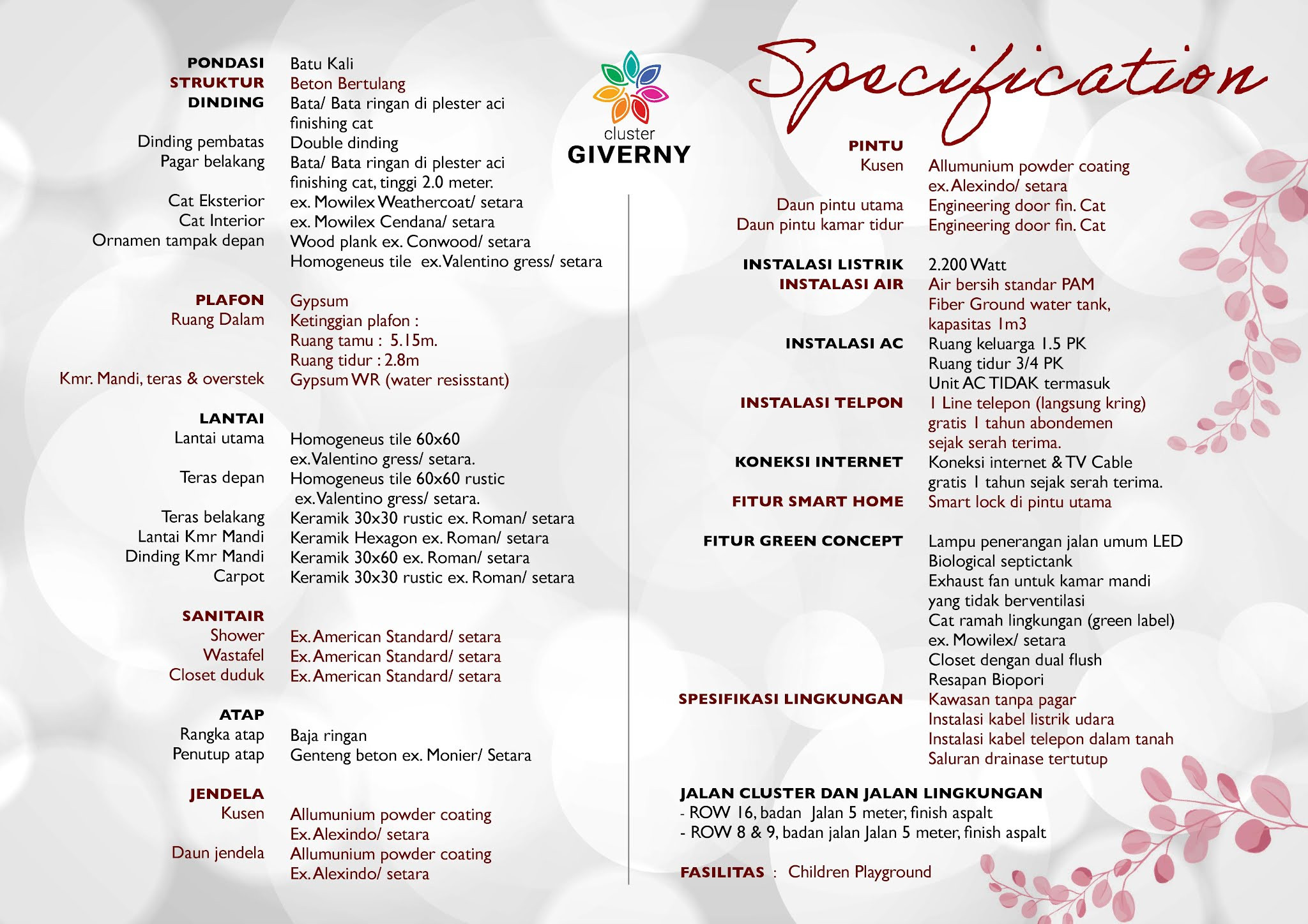 Fasilitas yang disediakan dalam cluster cukup lengkap dan dapat menunjang aktivitas penghuni sehari-hari. Terdapat playground anak, jogging track, dan smart lock door di main door. Untuk keamanan tidak perlu khawatir karena memiliki satu akses pintu masuk dengan sistem keamanan 24 jam dan CCTV.