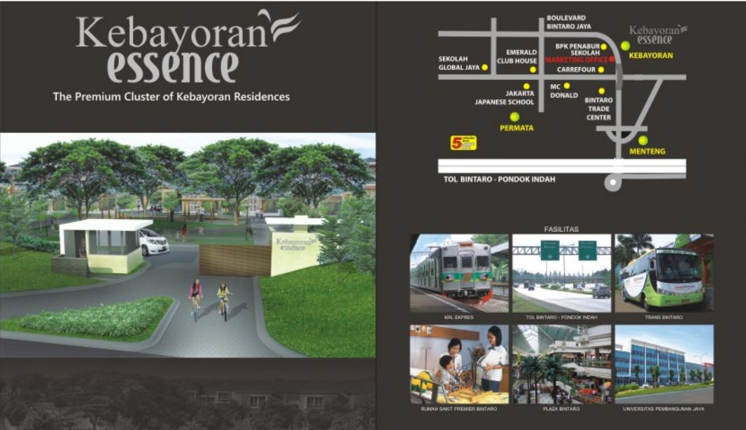 Kebayoran Essence merupakan salah satu cluster premium di kawasan Kebayoran Residences. Setiap unitnya didesain dengan desain modern elegan yang memadukan warna coklat dan warna netral. Lokasi cluster ini berada tidak jauh dari berbagai fasilitas umum, seperti British School Jakarta, Sekolah BPK Penabur, Sekolah Global Jaya, Universitas Bina Nusantara, RS Pondok Indah Bintaro Jaya, dan RS Premier Bintaro.