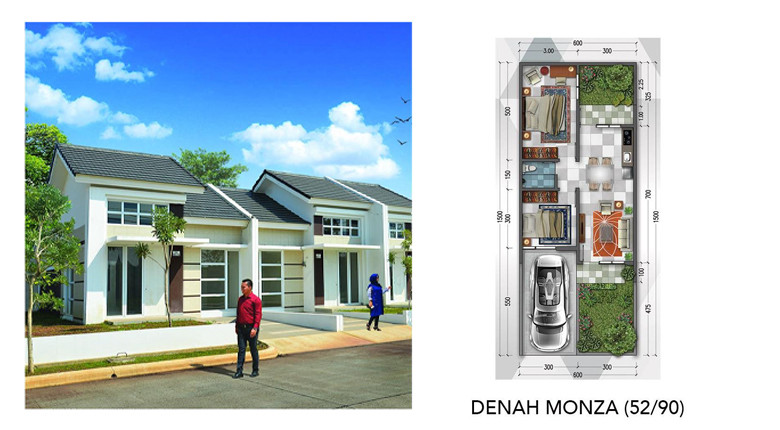 Unit Tipe Monza memiliki luas bangunan 52m2 di atas tanah seluas 90m2. Unit ini dilengkapi dengan 2 kamar tidur, 1 kamar mandi, dan 1 carport yang dapat memuat satu buah mobil. Unit tipe ini dipasarkan dengan harga Rp.950.000.000.