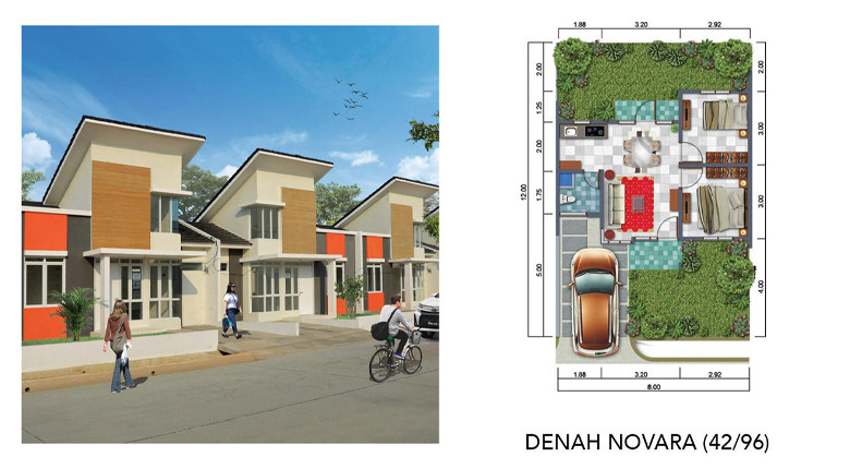 Unit Tipe Novara memiliki luas bangunan 42m2 di atas tanah seluas 96m2. Unit ini dilengkapi dengan 2 kamar tidur, 1 kamar mandi, dan 1 carport yang dapat memuat satu buah mobil. Unit tipe ini dipasarkan dengan harga Rp.841.000.000.